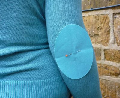 Take off the jumper or jacket, lay sleeve flat, remove paper backing from the patch and position it glue side down, with the pin roughly at its centre.  Press to apply following our patching pack directions.