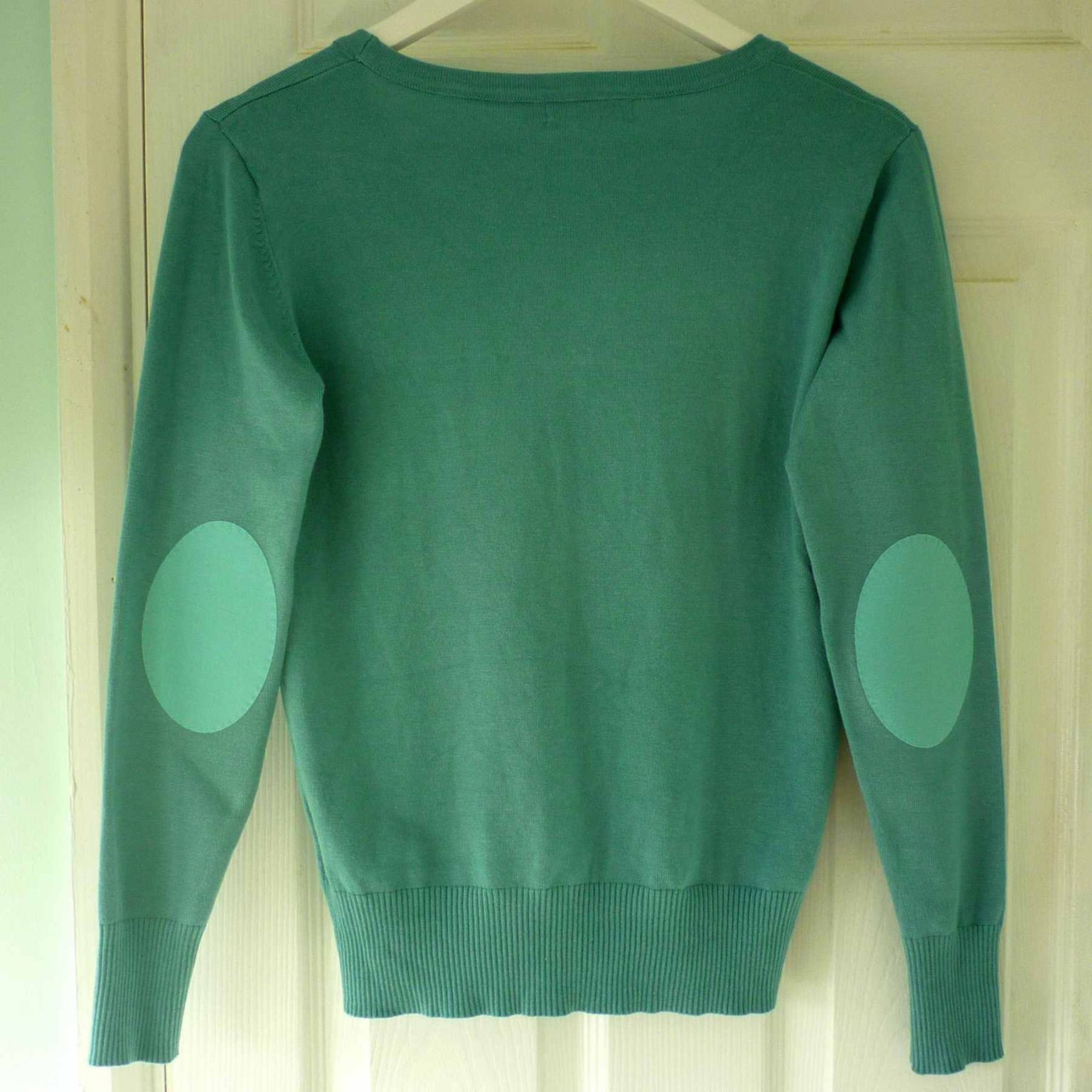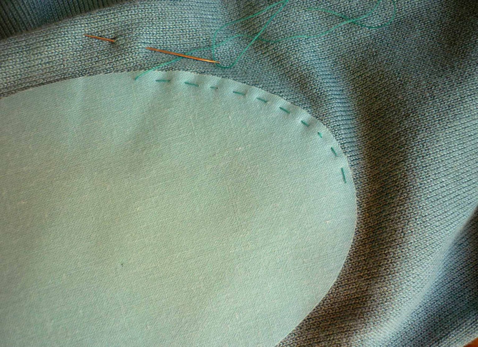 The main thing to keep in mind with elbow patches is positioning.  Put the garment on, bend arm and mark the point of the elbow onto the jumper with a pin or chalk.  Hopefully this will coincide roughly with the hole or damaged area, the aim being to cover the hole and the point of elbow where more wear may occur in future.