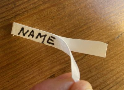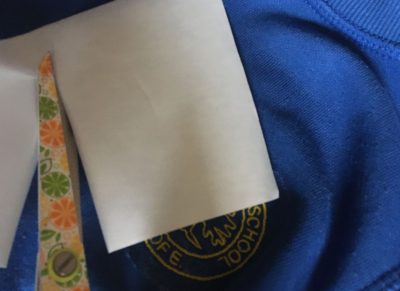 if you’ve run out of nametapes, here’s an easy hack.  Use an iron on cotton patch in white and cut it into an appropriate size strip. Write the name onto the strip with a fabric marker pen, peel off the strip’s backing and iron on to the garment.