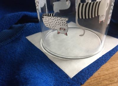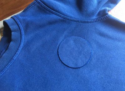 This sweatshirt had a logo from the previous school which needed covering.  The new school doesn’t require logos and the owner had an old sweatshirt too worn out to wear, so it was child’s play (forgive the pun) to harvest some matching fabric from that one and create an iron on circular patch.  As you see, any circular object of appropriate size can be used as a template for the patch.