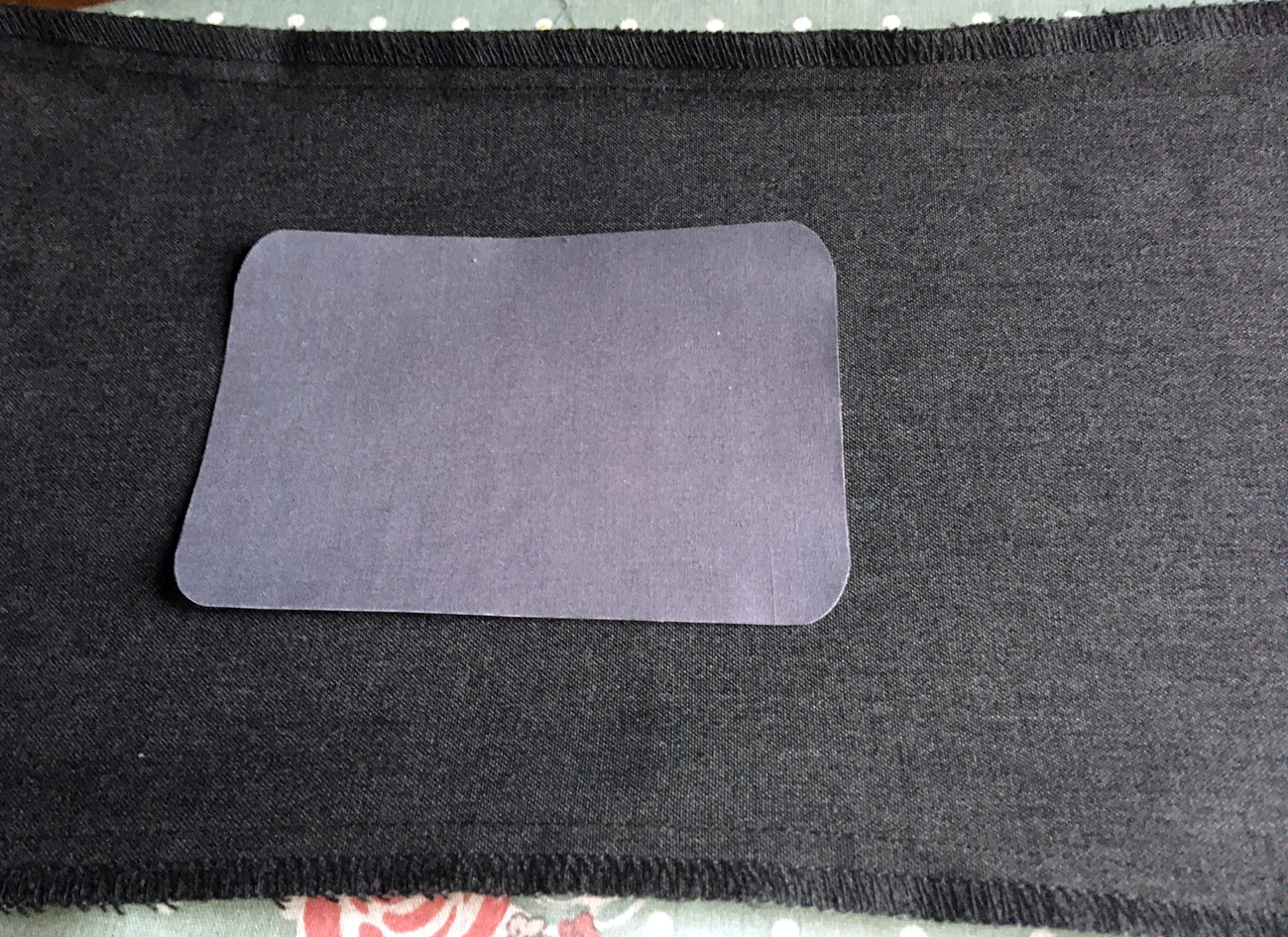 A grey cotton rectangle iron-on patch is used to strengthen the fabric on the inside knee area of school trousers