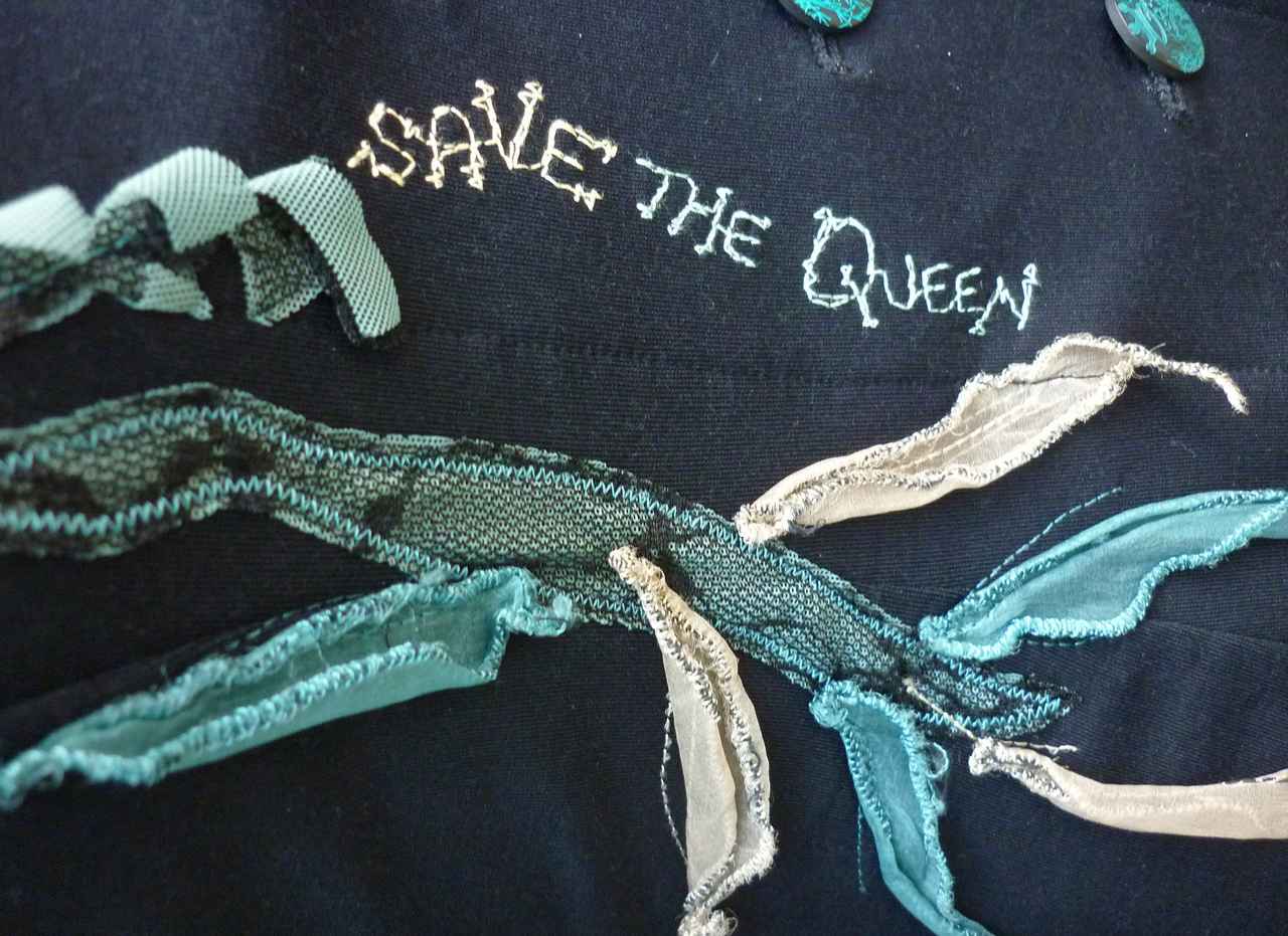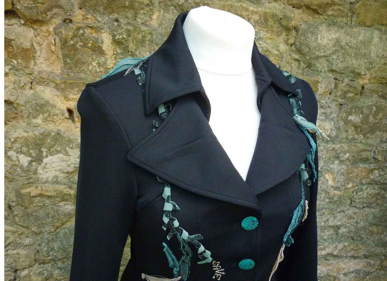Features: Beautifully crafted form fitting stretch blazer in soft polyamid cotton elastane blend fabric.  Princess seams and waistcoat style pointed hemline at front and an unusual asymetric back split and curved hemline . Wide double collar, full length sleeves with split detail. Unlined with slightly sheer back panel embroidered  and appliqued with turquoise and white leaves and lettered script. Further leaf and stem applique down both front panels and sleeve cuffs along with Save the Queen lettering.  Front fastening with 4 lovely turquoise feature buttons. A stunning jacket with top quality tailoring and finish. Perfect to dress up or down. Premium Italian Brand.