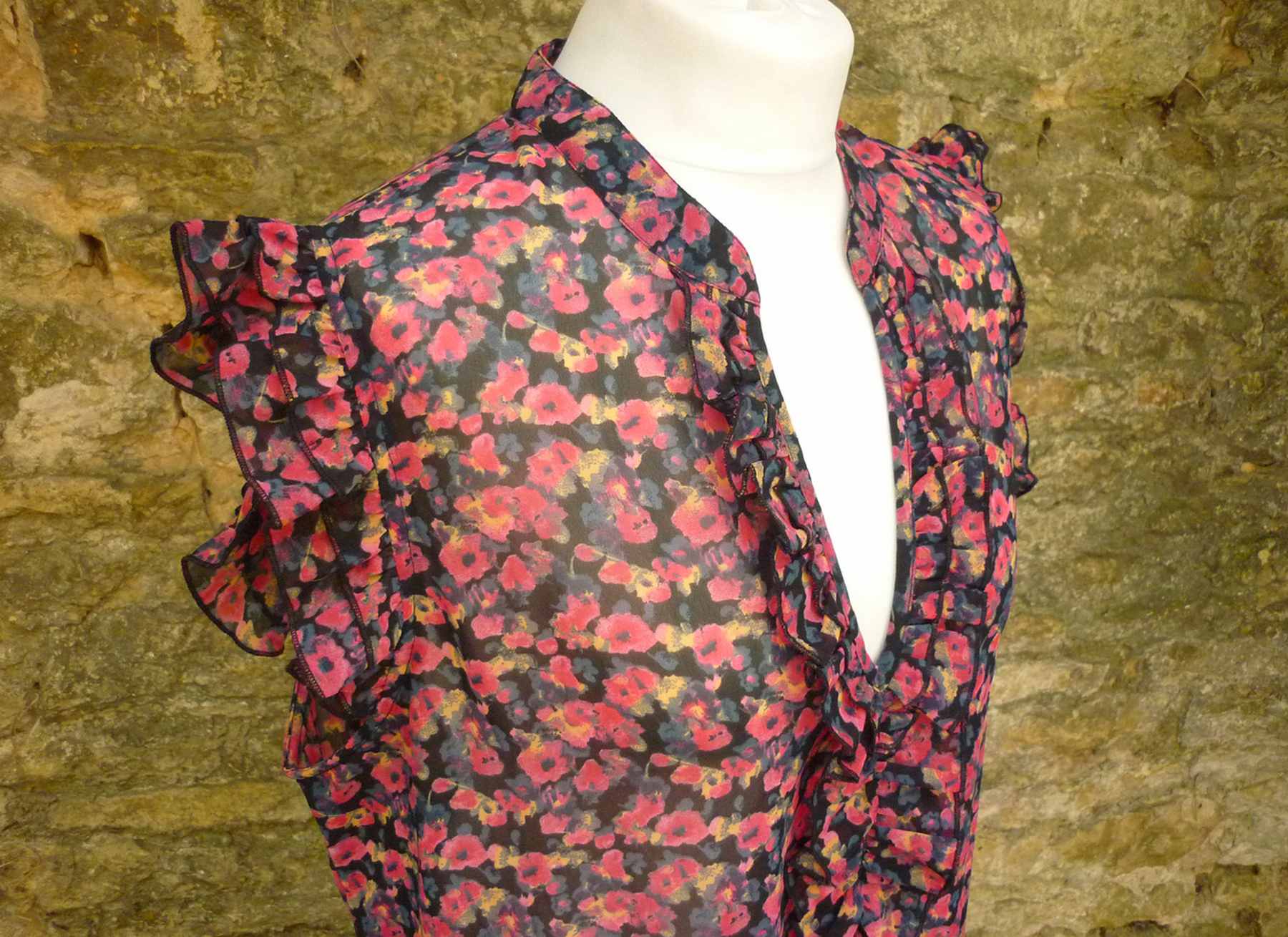 Features: Small round neck stand collar with v neck.  Half placket with pretty double ruffle. Sleeveless with ruffle feature around armhole.  Waist to hip length with shirred gathering at the waist area with small frill at hemline.  Slightly sheer fabric in attractive black and pink floral print. Elegant and light for the summer but smart enough for evening occasions.