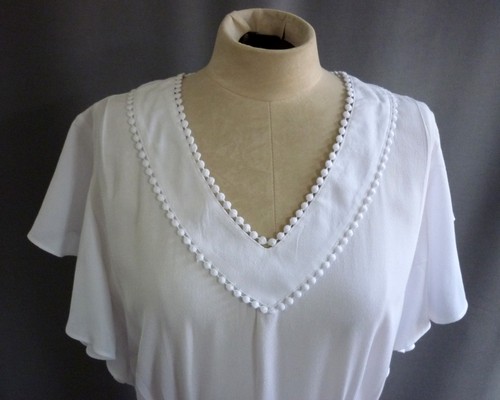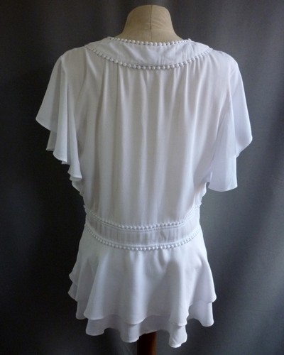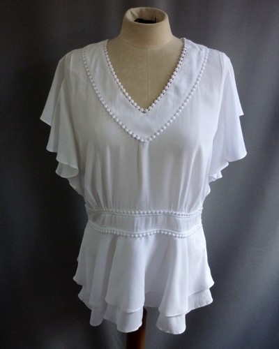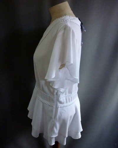 Gorgeous BNWT TU White V Neck Peplum Style Top, Very pretty and flattering garment featuring decorative trim at neck and waist and ruffle style sleeves. Side zip for ease of dressing. Originally retailed at £25.00
