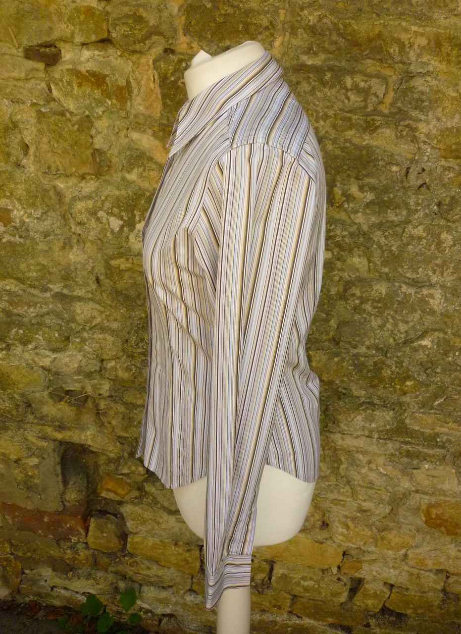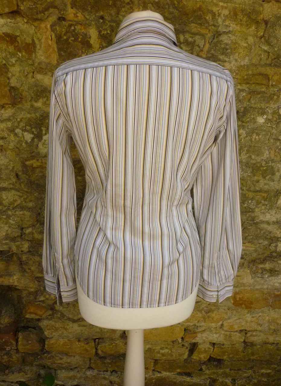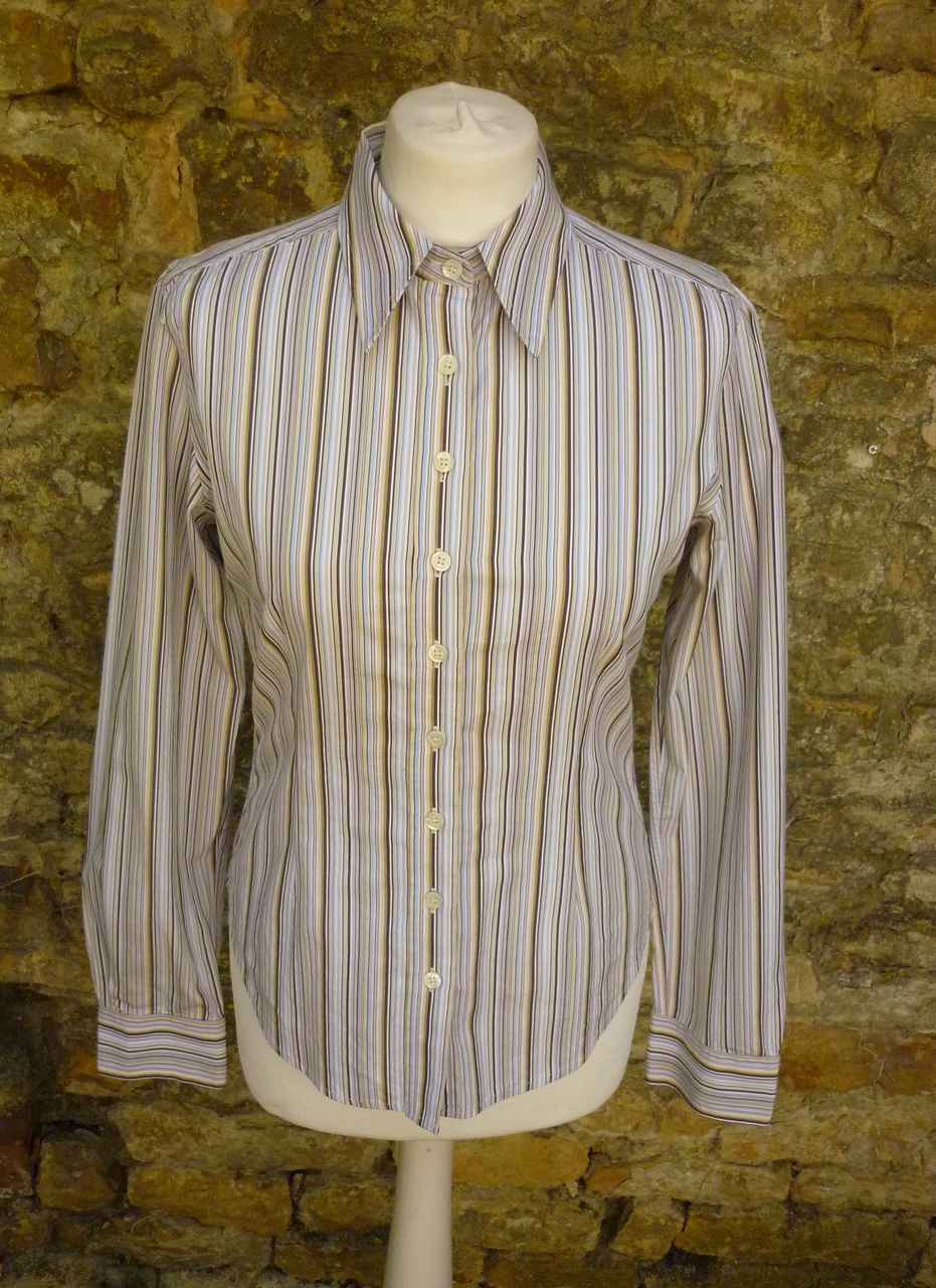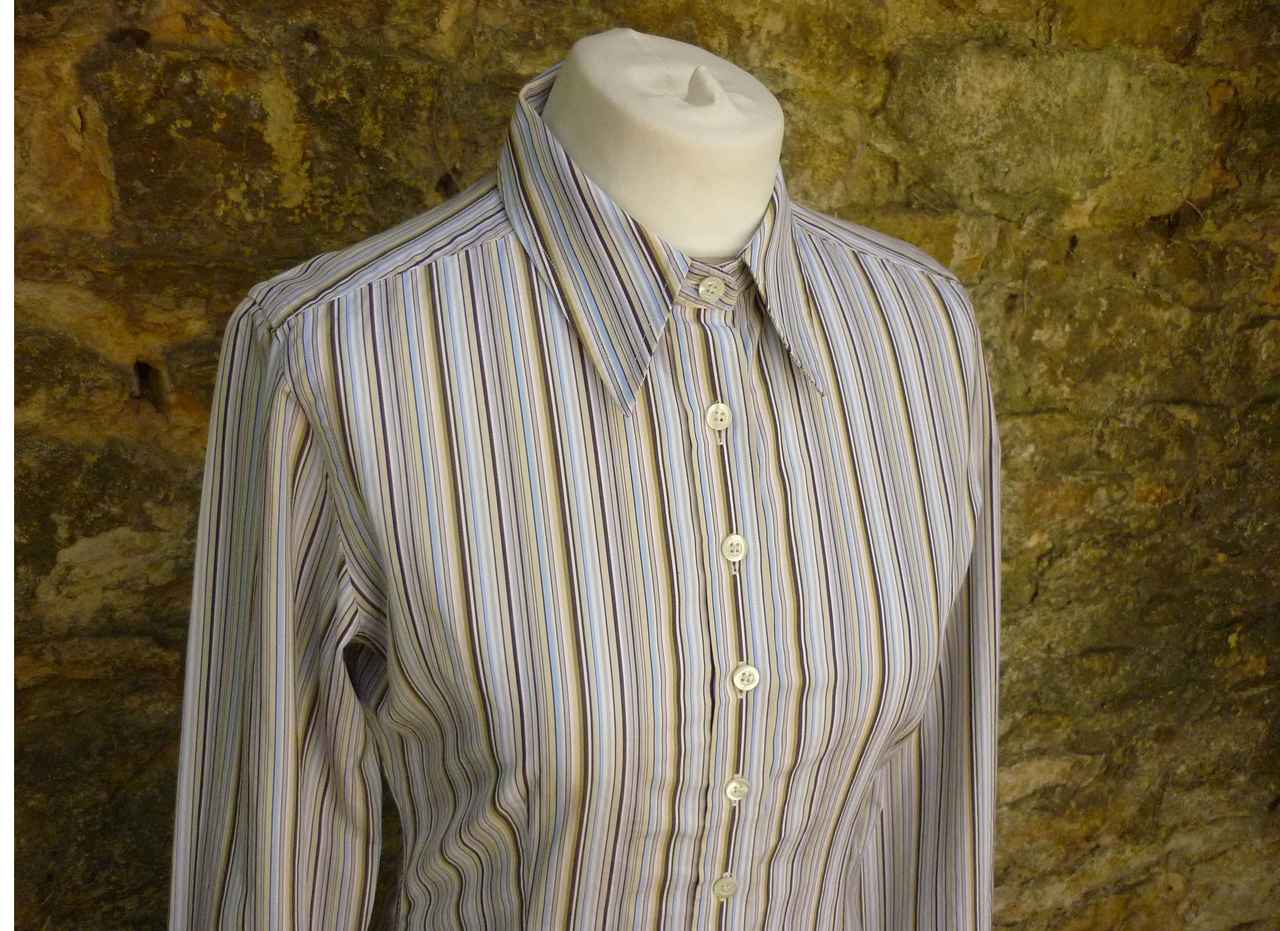 Features: Smart and crisp brown stripe pure cotton fabric, flattering shaped fit with curved hemline, full length sleeves with button cuffs. Excellent quality garment by this prestige brand.