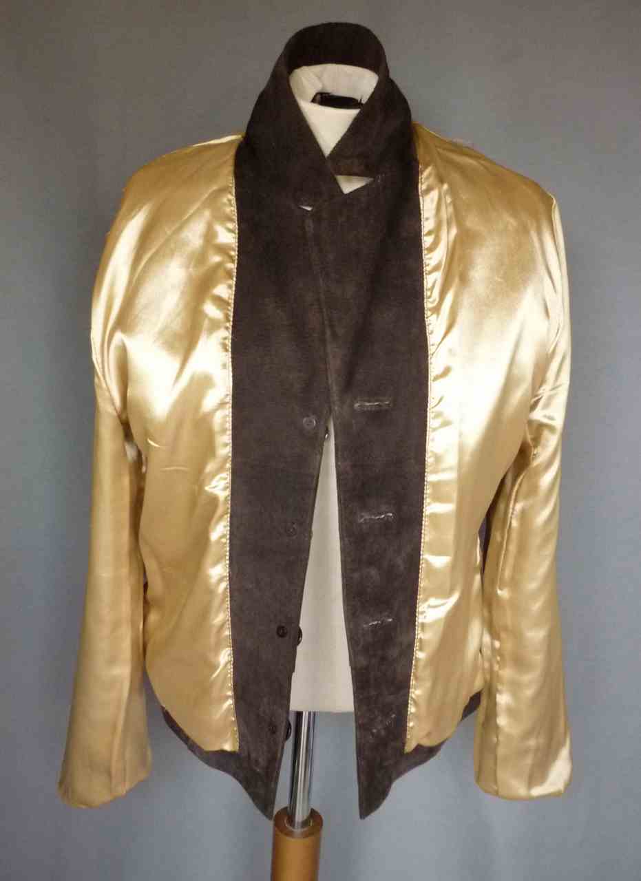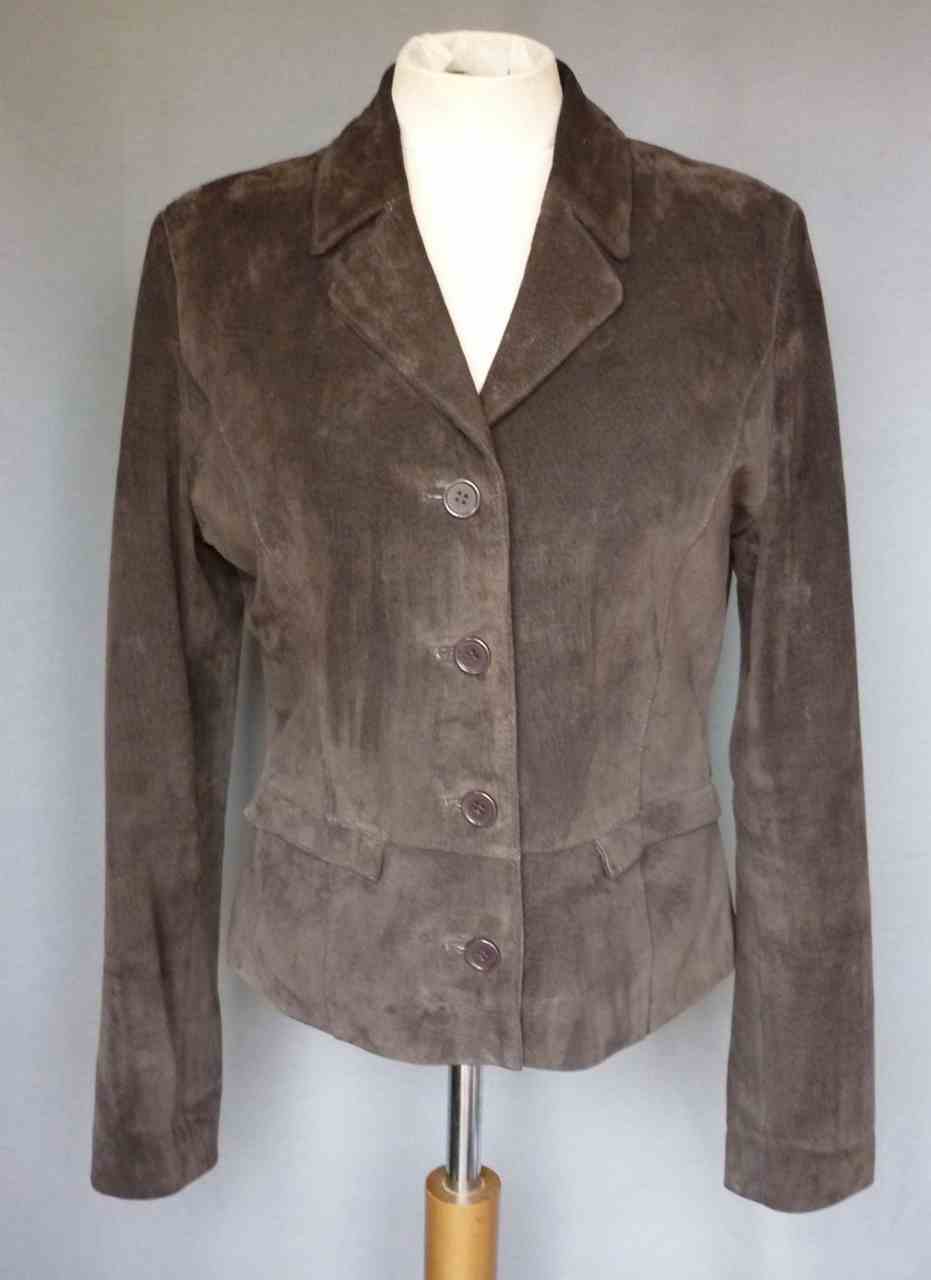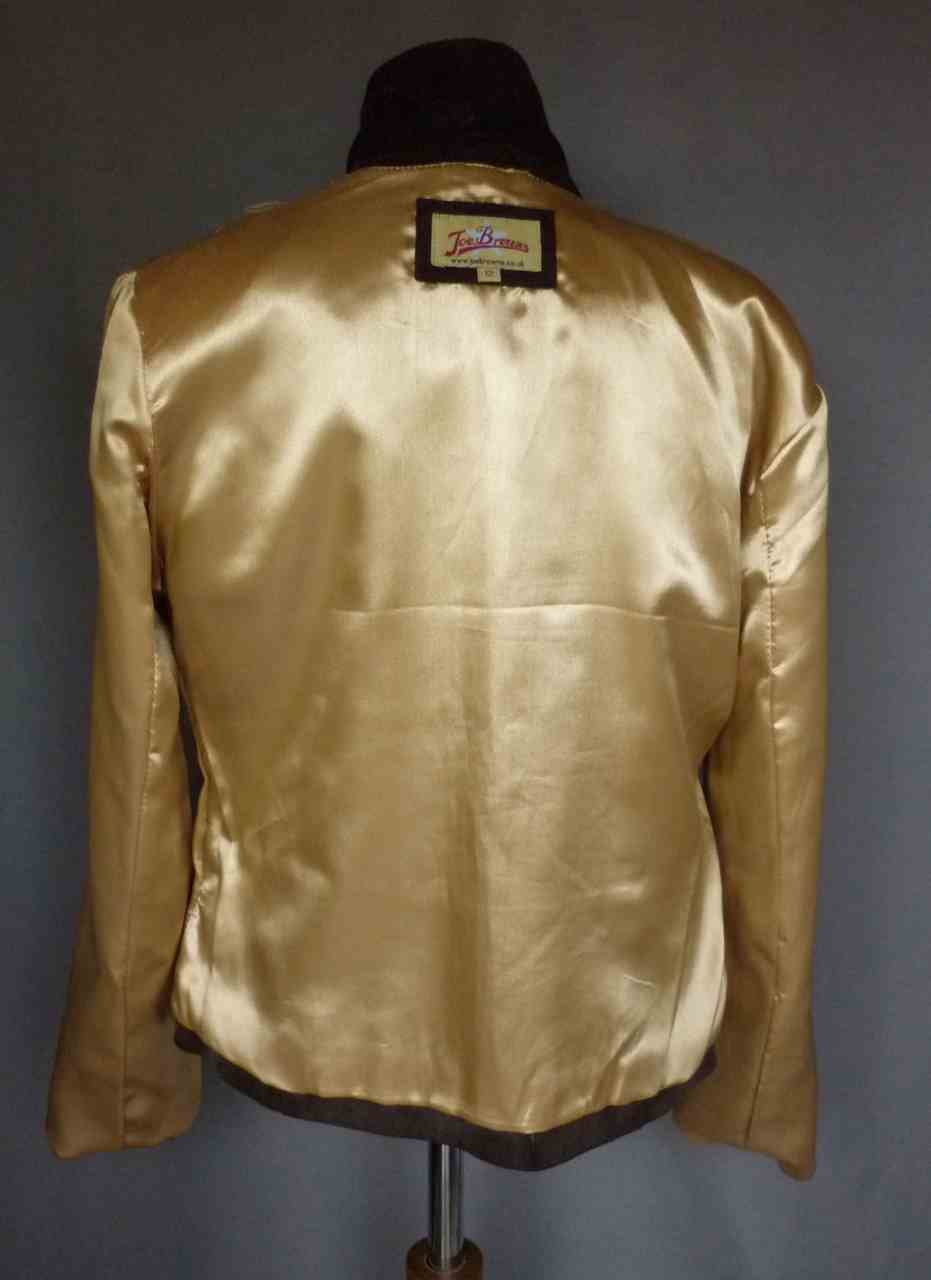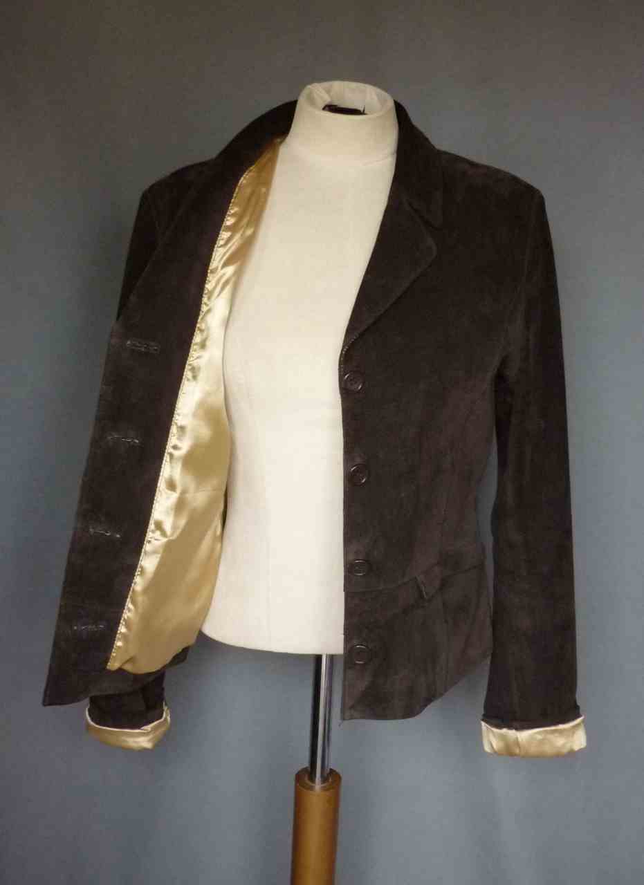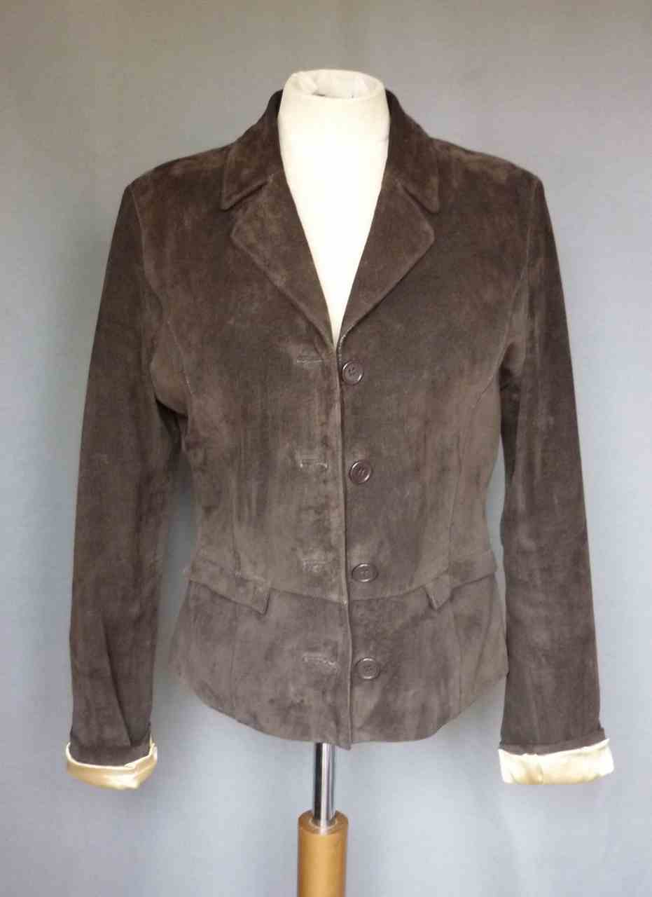 Beautiful ladies rich brown suede fitted cropped blazer jacket by Joe Browns. Vintage style with notched collar, button front with two inset pockets at the waist, princess seams and lovely gold satin lining which looks great with the sleeves rolled up (see pics).