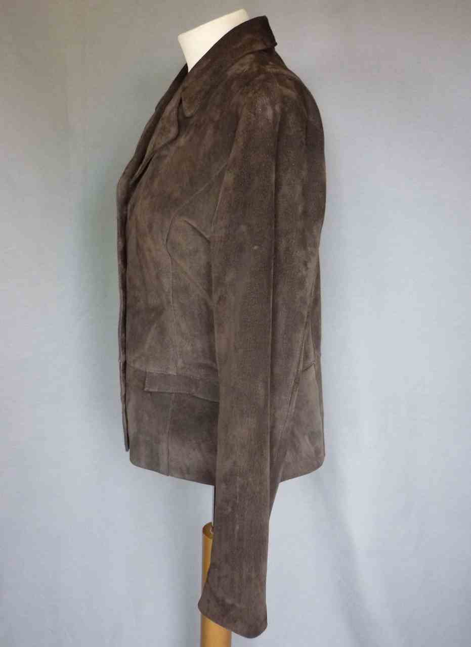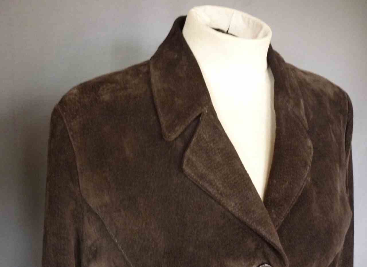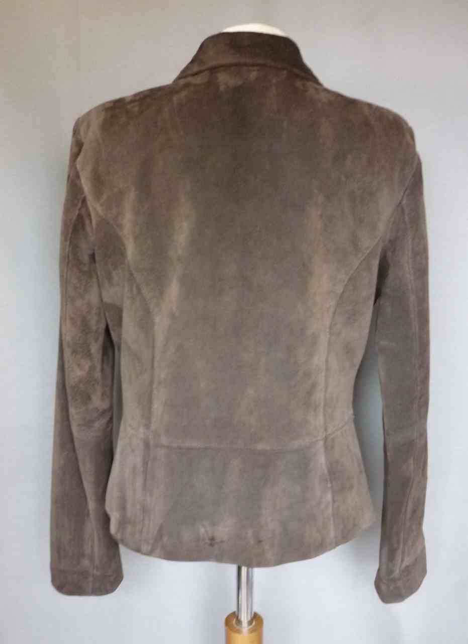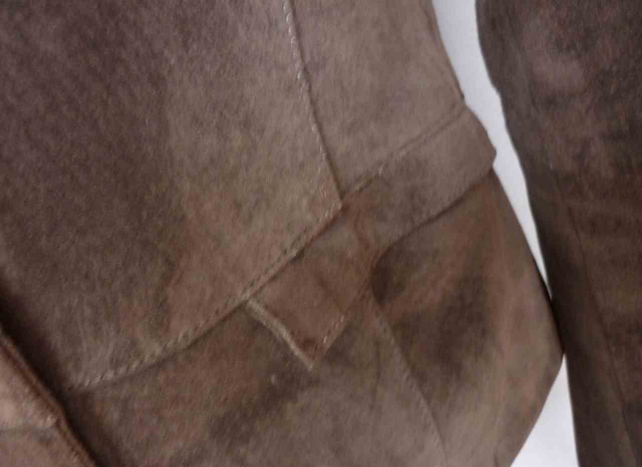 *There is a small mark (0.5cm) on the back bottom panel of the jacket which may be visible in certain light conditions when the nap of the suede is smoothed flat (it is not visible when the nap is brushed normally and is difficult to see in a photograph – an enlarged picture is included). The garment is priced taking this into account.