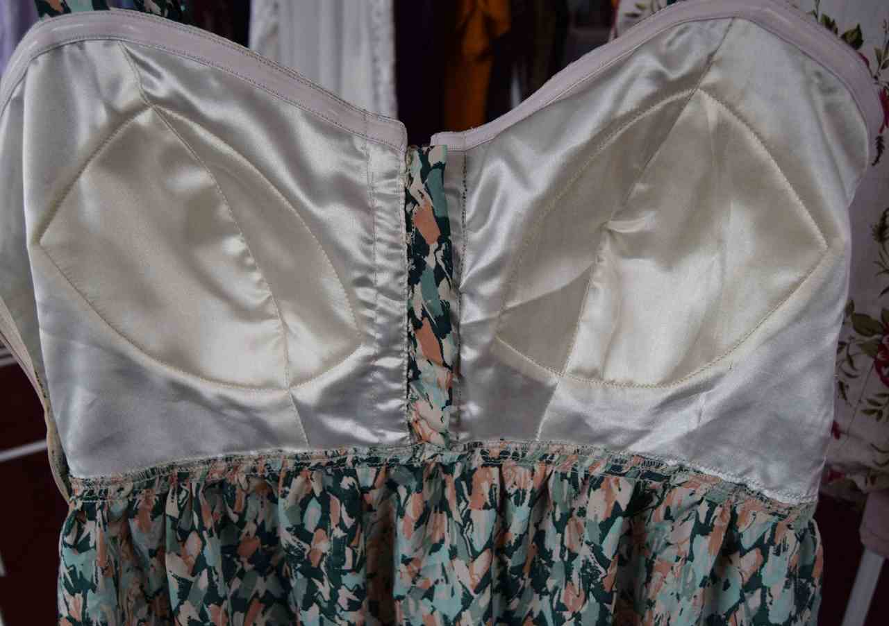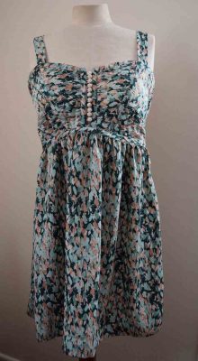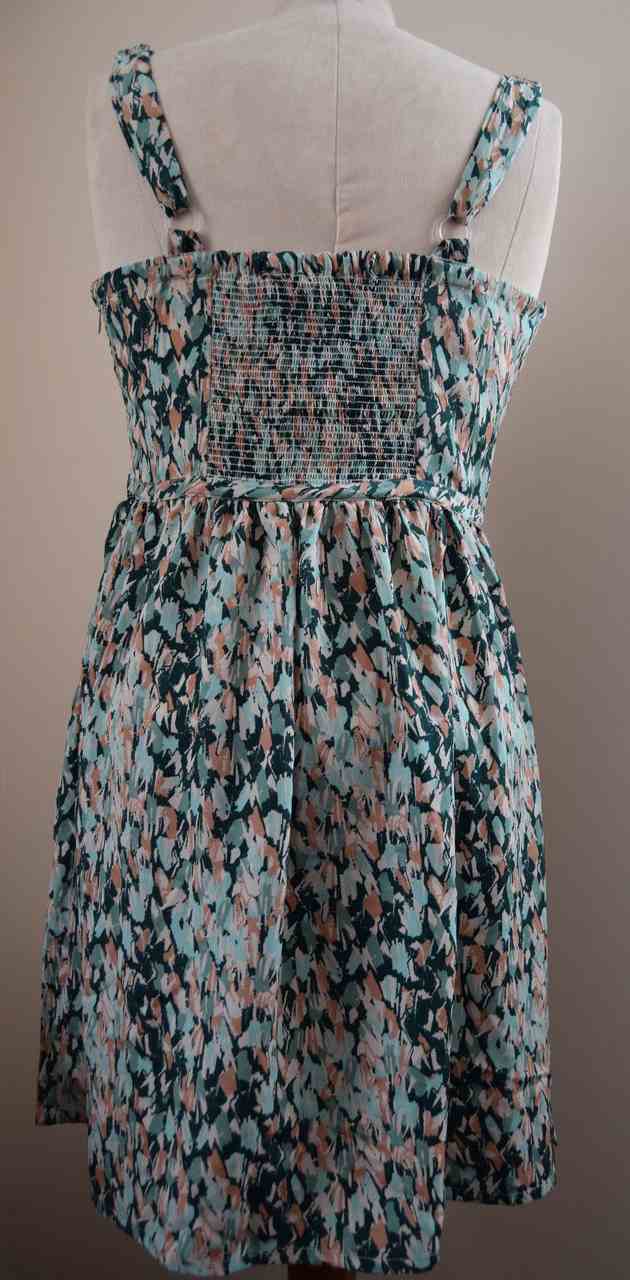 Features lined bra bodice for support, ruched back and wide straps for comfort. Button detail on front of bodice and silky fabric make this a very feminine dress for the summer.