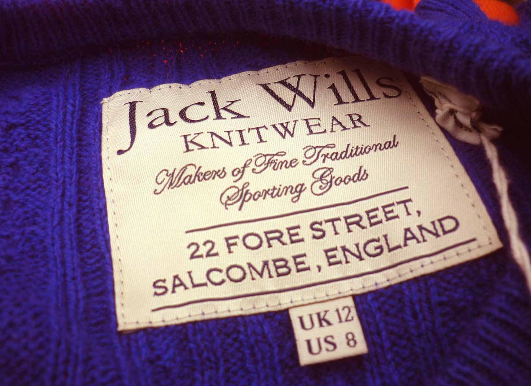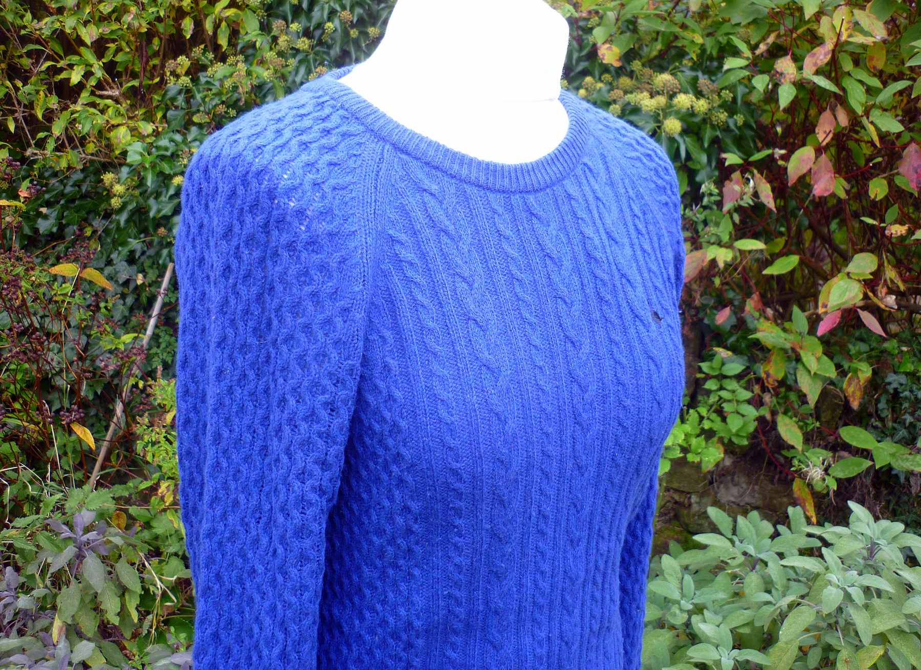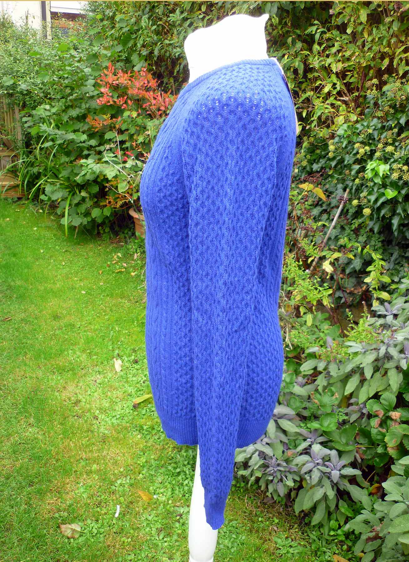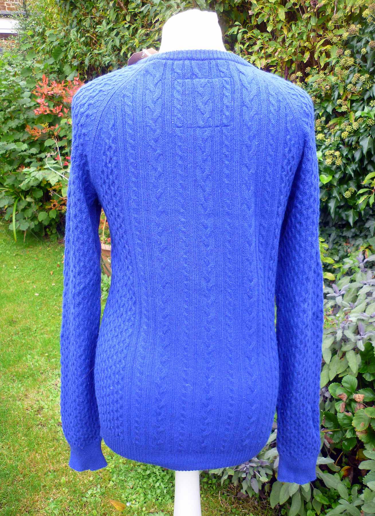 Features: Navy blue (the shade is midway between royal blue and navy – see brand label photo for best respresentation of the colour) Merino wool and cotton mix soft knit with vertical cable pattern throughout. Hip length with round neck and long sleeves. The weight of this garment is suitable for cross season making it a great wardrobe staple from this popular heritage brand.