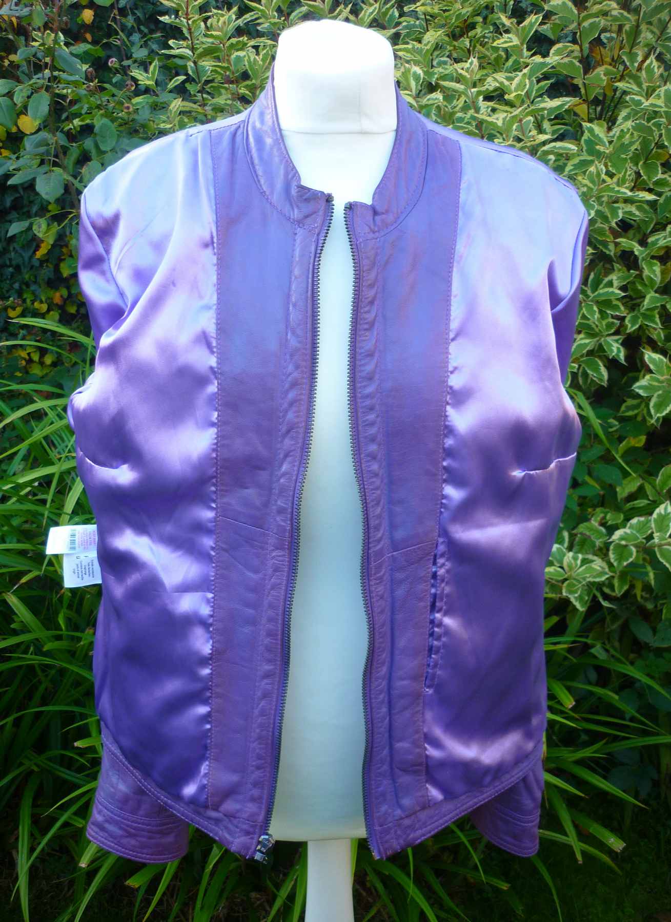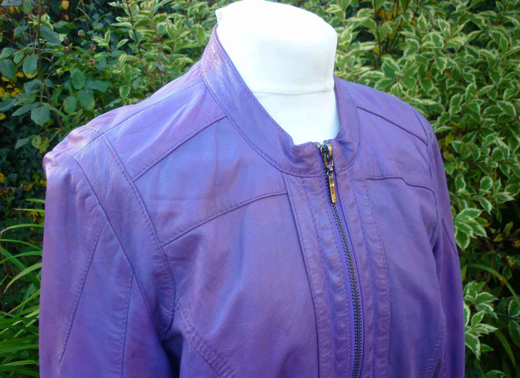Features: Butter soft mid purple to lavender lambskin – the colour has subtle variations throughout the garment giving it a very attractive retro appearance. Classic round neck collar, princess seams front and back for a close fit, back and front yoke and cuffed sleeves and hemline. Two front vertical zip pockets and front zip fastening. Luxurious satin lining. This is a very well made garment with a figure flattering fit. A classic design that will look great for decades to come, from a quality German brand.