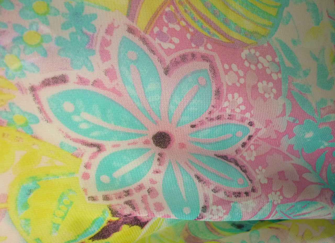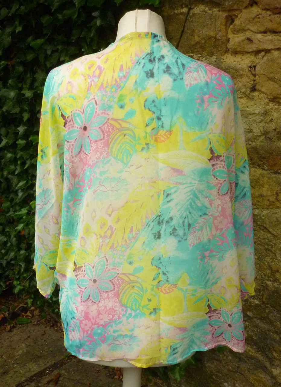 Features: Very pretty floral pattern sheer chiffon fabric, loose fit style with raglan half length sleeves.  Quality brand. Versatile lightweight garment equally at home on the beach or at a party.