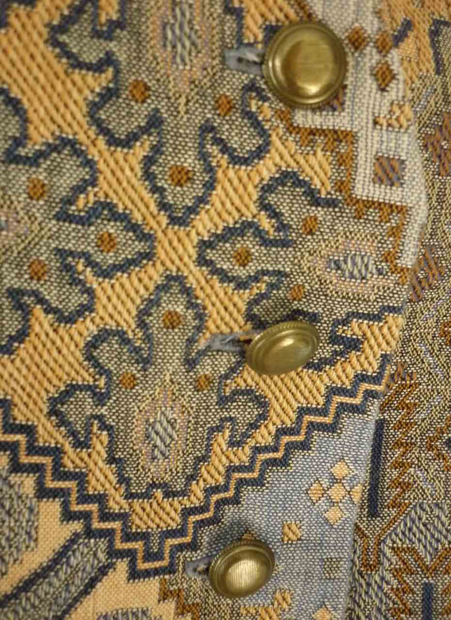 Features: Woven Tapestry Design at the front, mock silk back with strap adjustment, 5 brass buttons, cotton blend fabric. ,