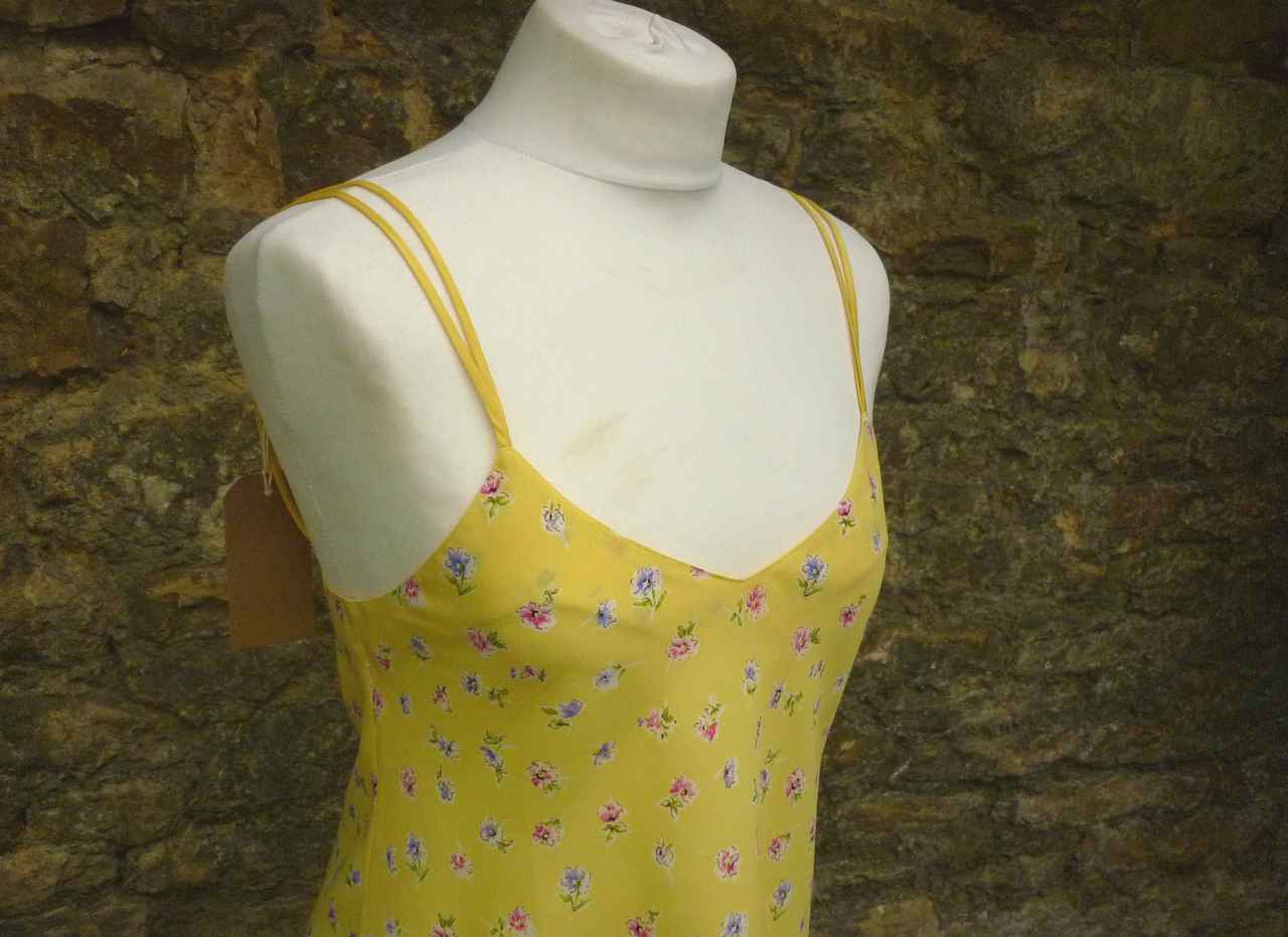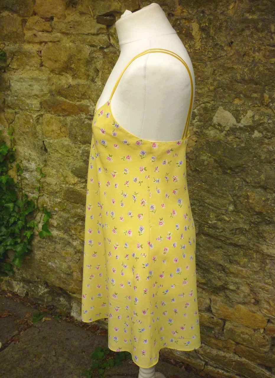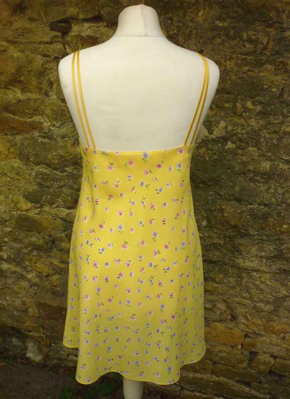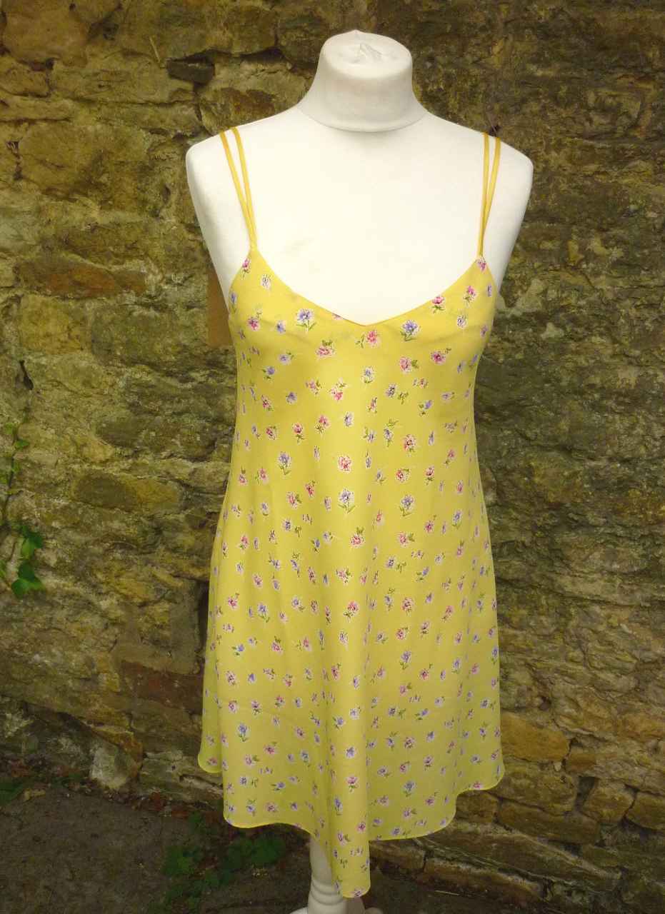Features: Bias cut slipdress shape with thigh length softly flared skirt. Double yellow ribbon shoulder straps. A very pretty and feminine design in fresh yellow floral print.